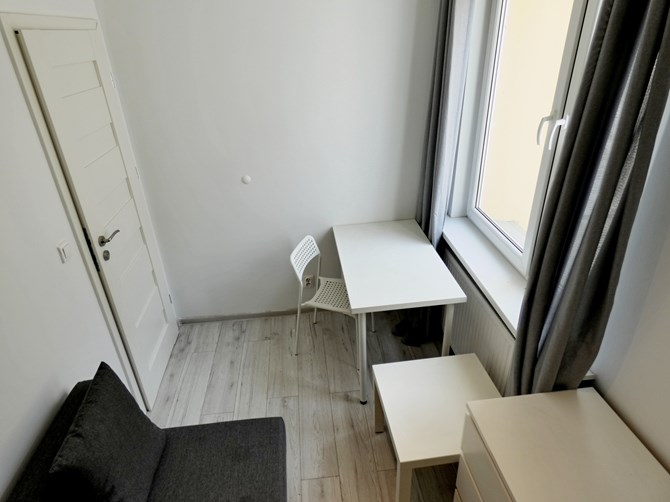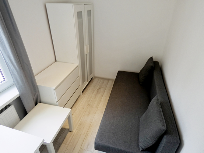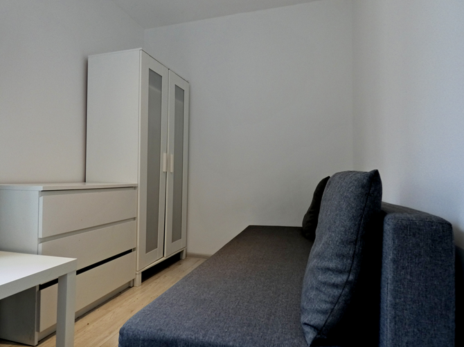 Pokój: łóżko rozkładane, szafa, biurko + krzesło, komoda.