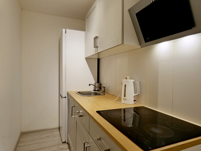 Kuchnia: lodówko-zamrażarka, okap, 4-palnikowa płyta indukcyjna, mikrofalówka, czajnik elektryczny, zlew z ociekaczem.