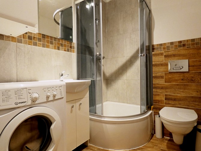 Łazienka: pralka, prysznic, WC, umywalka.