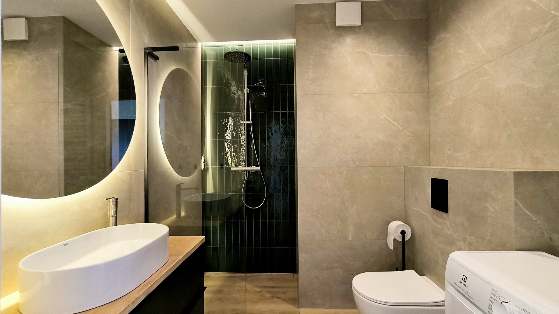 Łazienka: kabina prysznicowa, szafka, umywalka, WC, lustro, pralka.