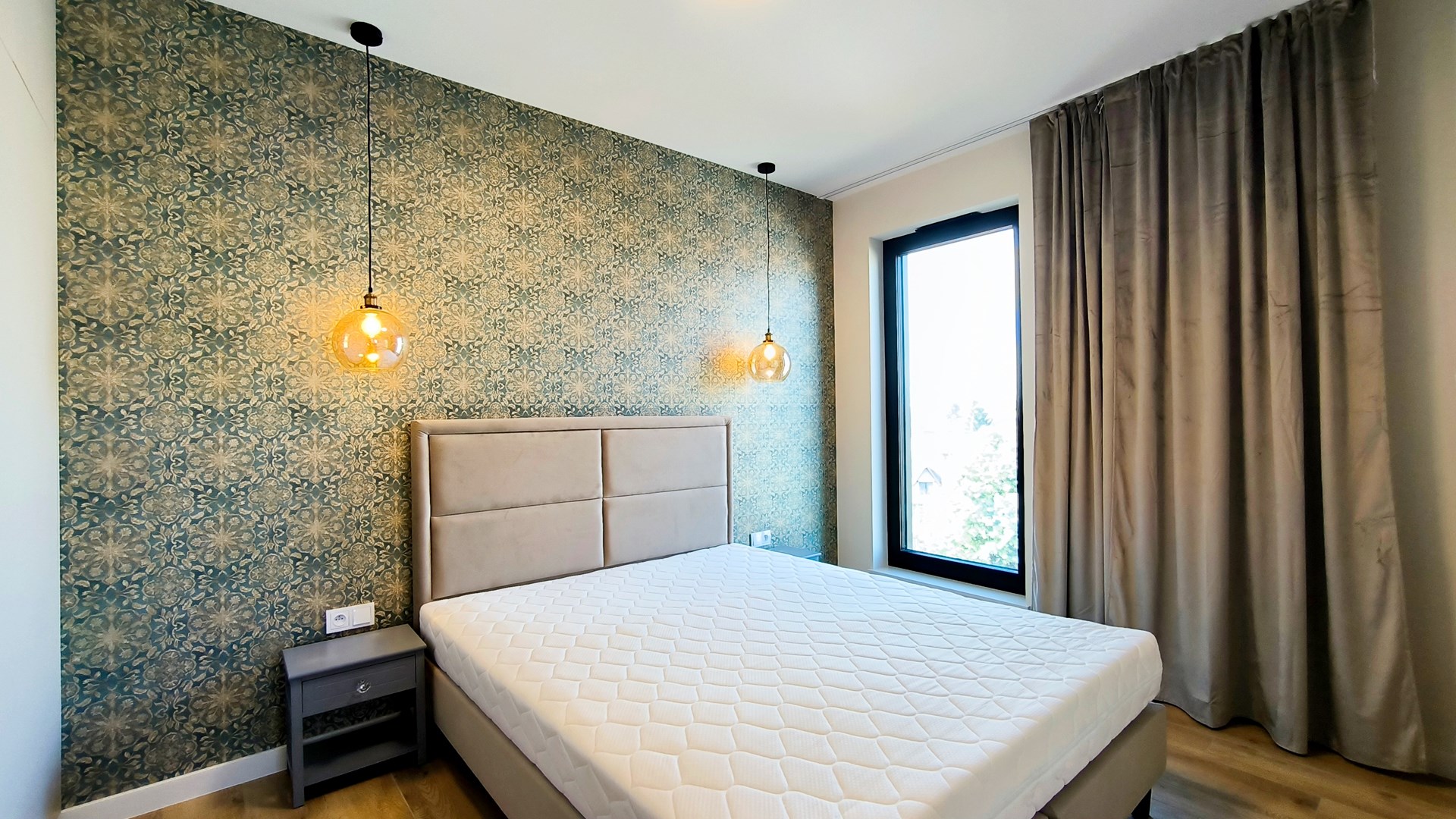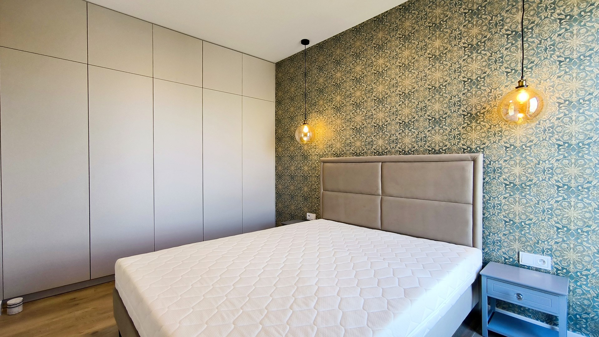 Sypialnia: łóżko podwójne, szafa 5D w zabudowie, 2 szafki nocne.