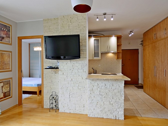 Składa się z salonu połączonego z aneksem kuchennym, oddzielnej sypialni, łazienki, przedpokoju oraz dużego balkonu.