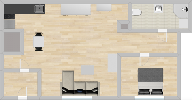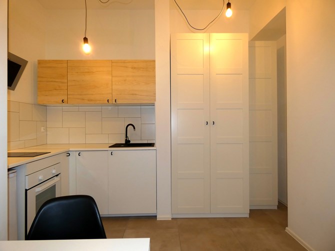 Kuchnia: kuchni szafki wiszące i stojące, lodówka, dwupalnikowa płyta indukcyjna, zlewozmywak.