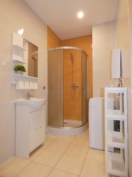 Łazienka razem z WC: lustro z półką, kabina prysznicowa, pralka.