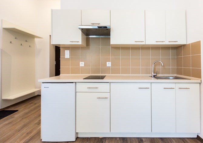 Kuchnia: szafki wiszące i stojące, lodówka, dwupalnikowa płyta indukcyjna, zlewozmywak.