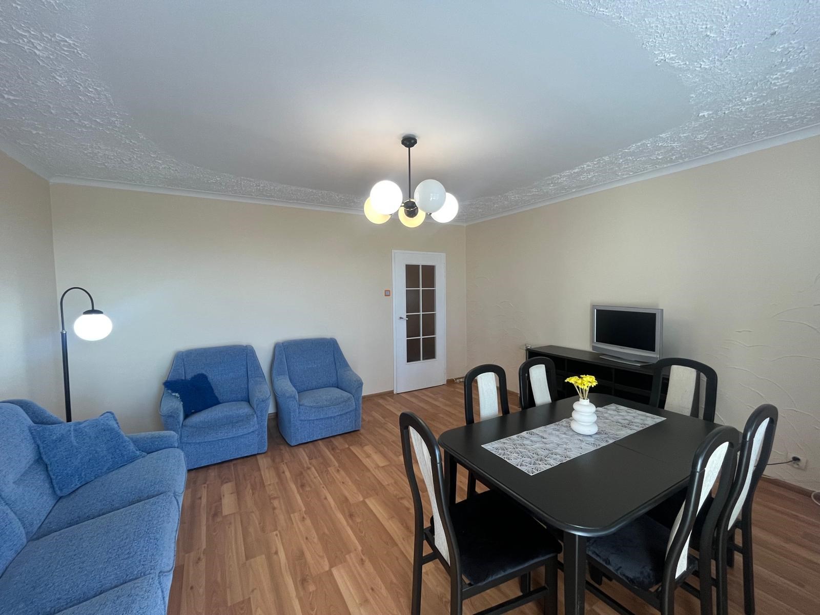 Pokój 1: rozkładana kanapa, dwa fotele, komoda, stół, krzesła.