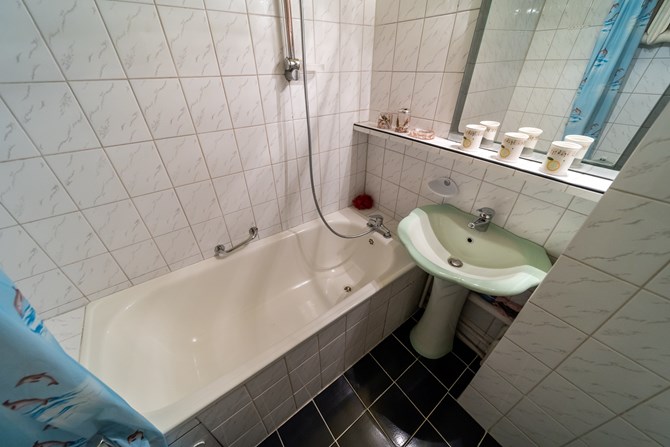 Łazienka: wanna, umywalka, szafka.