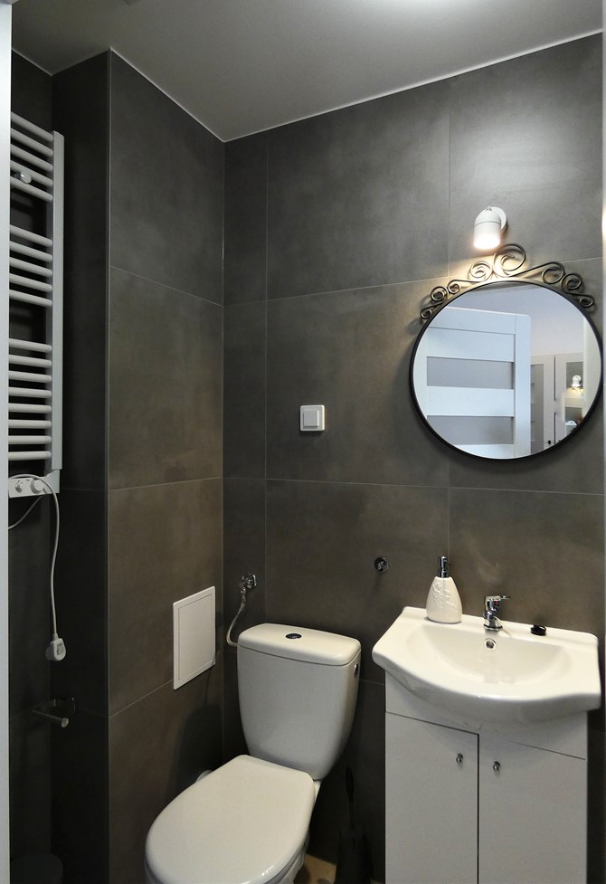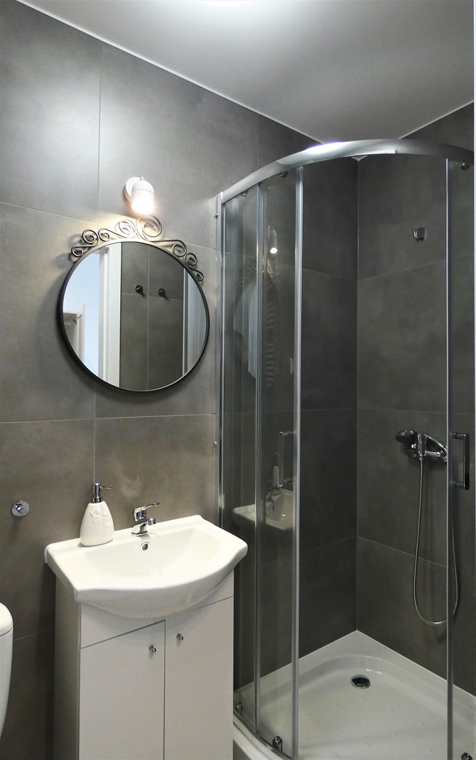 Łazienka razem z WC: kabina prysznicowa, lustro z umywalką.