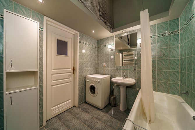 Łazienka: wanna, toaleta, umywalka, lustro, pralka.