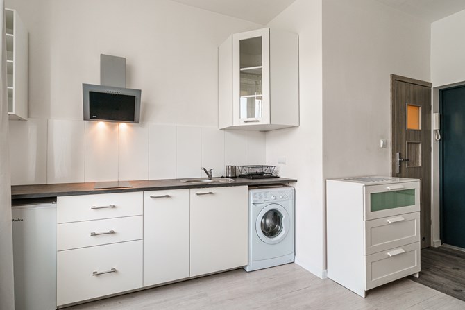 Aneks kuchenny w zabudowie ze sprzętem AGD (lodówka, płyta indukcyjna 2-palnikowa, pralka, okap).