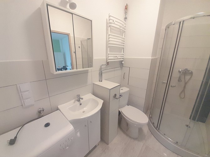 Łazienka z WC: szafka, lustro, kabina prysznicowa
