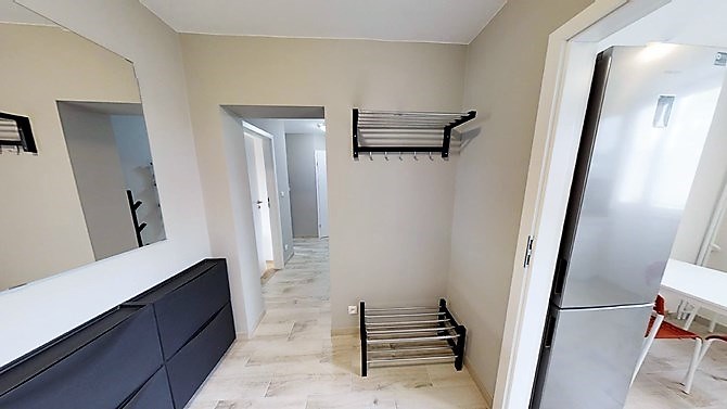 Przedpokój: szafa, wieszaki, szafki na buty.