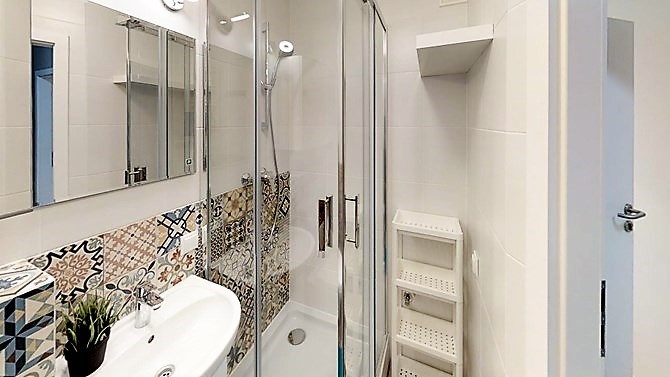 Łazienki: kabiny prysznicowe, umywalki, szafki, półki, wc, pralka.