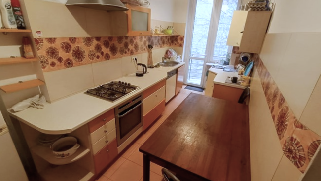 Kuchnia: szafki, lodówka, piekarnik, stół, krzesła.