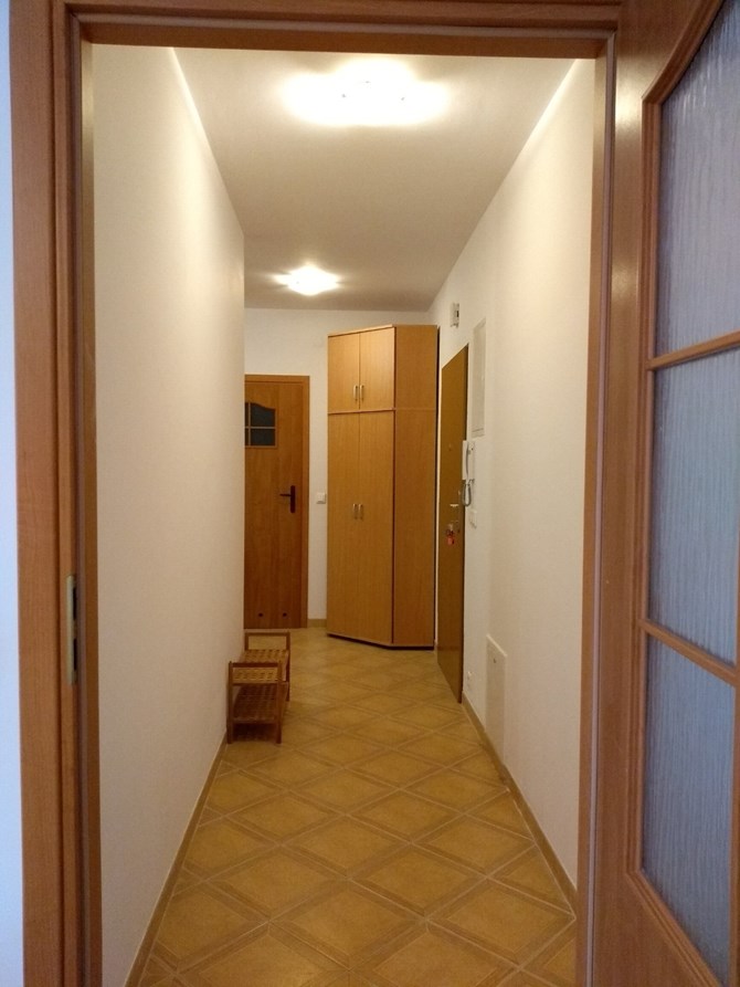 W przedpokoju znajduje się szafa, szafka na buty i regał.