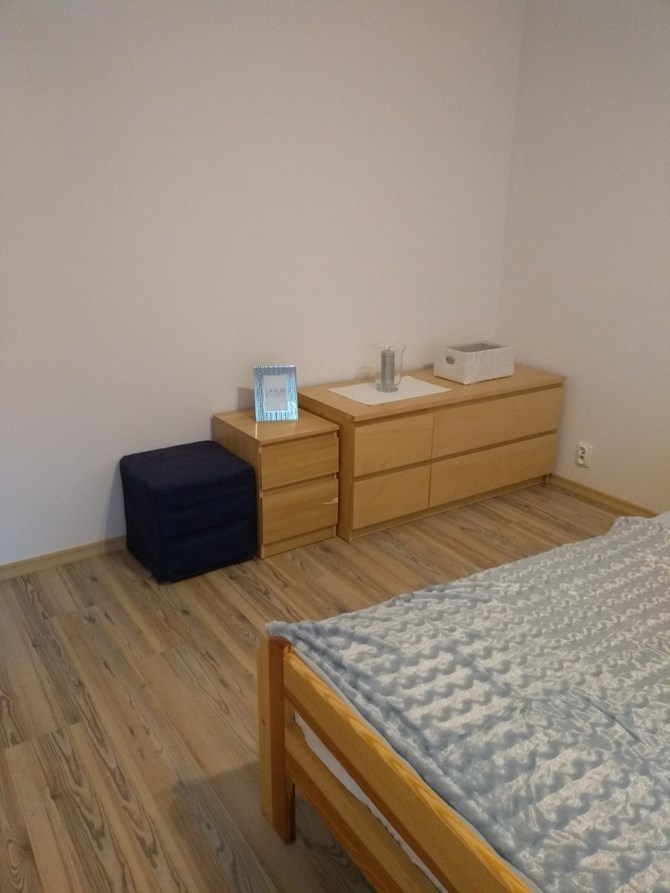 W sypialni znajduje się podwójne łóżko, komoda, szafka nocna, biurko.