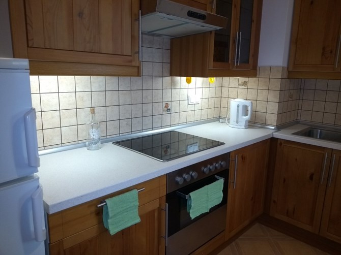 W kuchni jest sporo szafek , stół, 2 krzesła, lodówka z zamrażarką, zmywarka, piekarnik z kuchenką elektryczną 4 palnikową, okap.