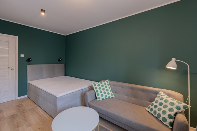 Pokój: łóżko podwójne, szafa, komoda, sofa, stolik kawowy