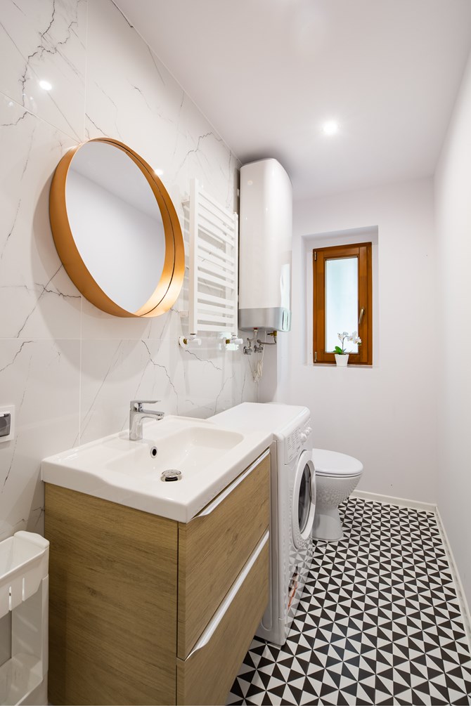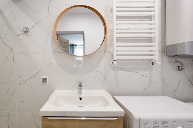 Łazienka razem z WC: lustro z półką, kabina prysznicowa, pralka i wieszaki oraz umywalka