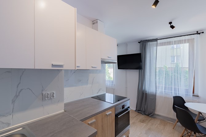 Kuchnia: szafki wiszące i stojące, lodówka, czteropalnikowa płyta indukcyjna, zlewozmywak, piekarnik, stół z krzesłami i telewizor