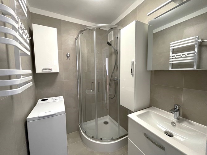 Łazienka: kabina prysznicowa, umywalka , szafka, pralka.