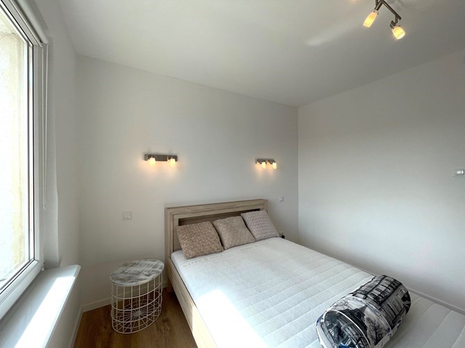 Sypialnia : podwójne łóżko, komoda, szafa , stolik nocny.