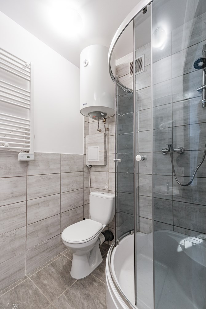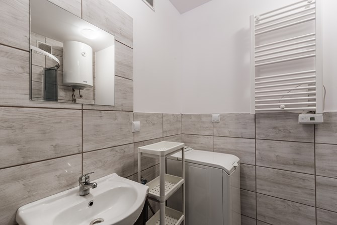Łazienka z WC: kabina prysznicowa, umywalka, pralka