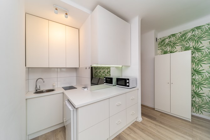 Kuchnia: lodówka, zlewozmywak, szafki, płyta grzewcza, kuchenka mikrofalowa.