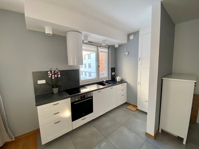 Aneks kuchenny: szafki, lodówka, czteropalnikowa płyta indukcyjna, piekarnik, zlewozmywak, mikrofalówka.