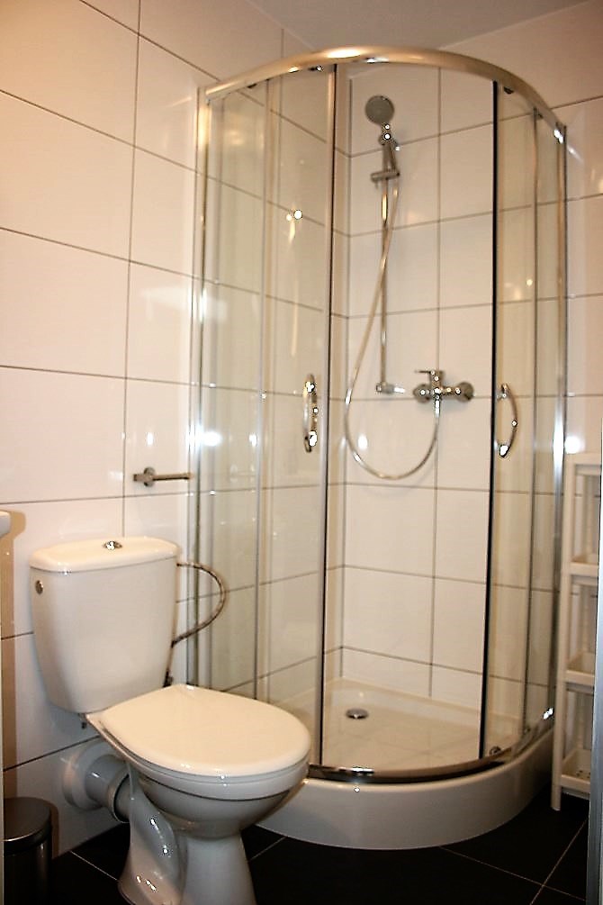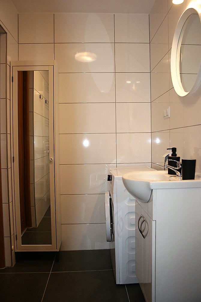 Łazienka: kabina prysznicowa, pralka, umywalka z szafką i dużym lustrem, WC.