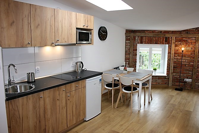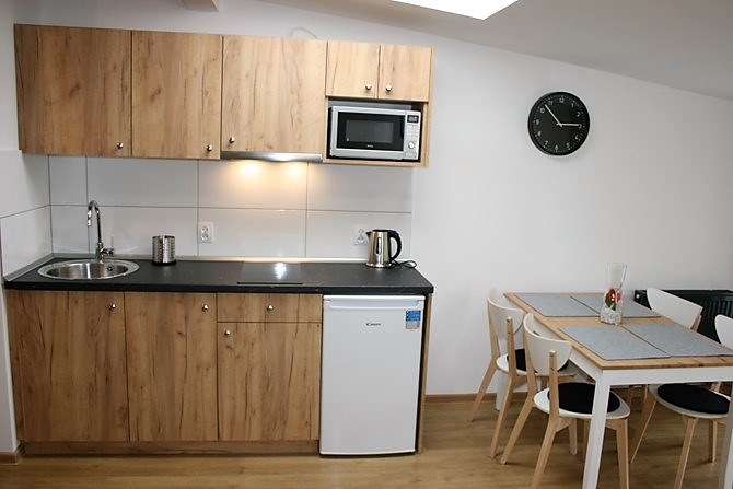 Aneks kuchenny: lodówka, kuchenka, mikrofalówka, okap, zlew, szafki.