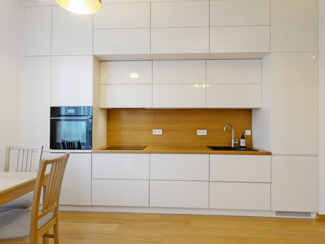 Kuchnia: lodówko-zamrażarka, okap, 4-palnikowa płyta indukcyjna, zmywarka, piekarnik, zlew z ociekaczem.