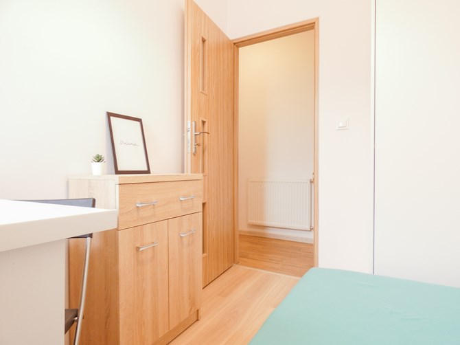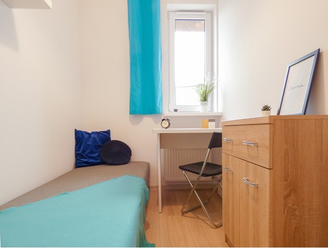 Pokój wyposażony w pojedyncze łóżko, biurko, komodę oraz szafę na ubrania.