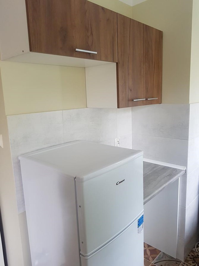 *Kuchnia: komplet szafek kuchennych, zlew, kuchnia z piekarnikiem, lodówka, blat roboczy