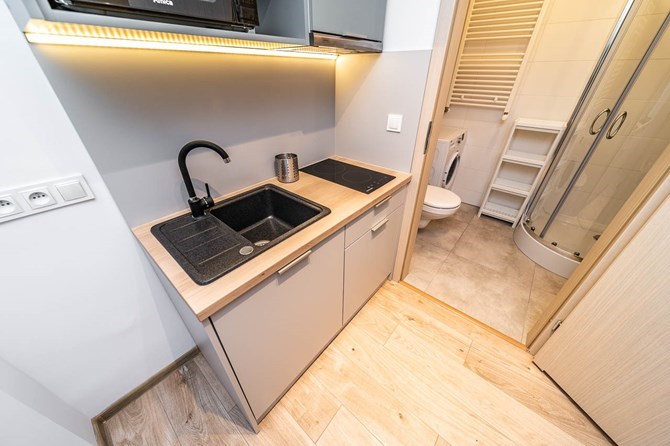 Aneks kuchenny: szafki wiszące i stojące, lodówka, dwupalnikowa płyta elektryczna, zlewozmywak, mikrofalówka.
