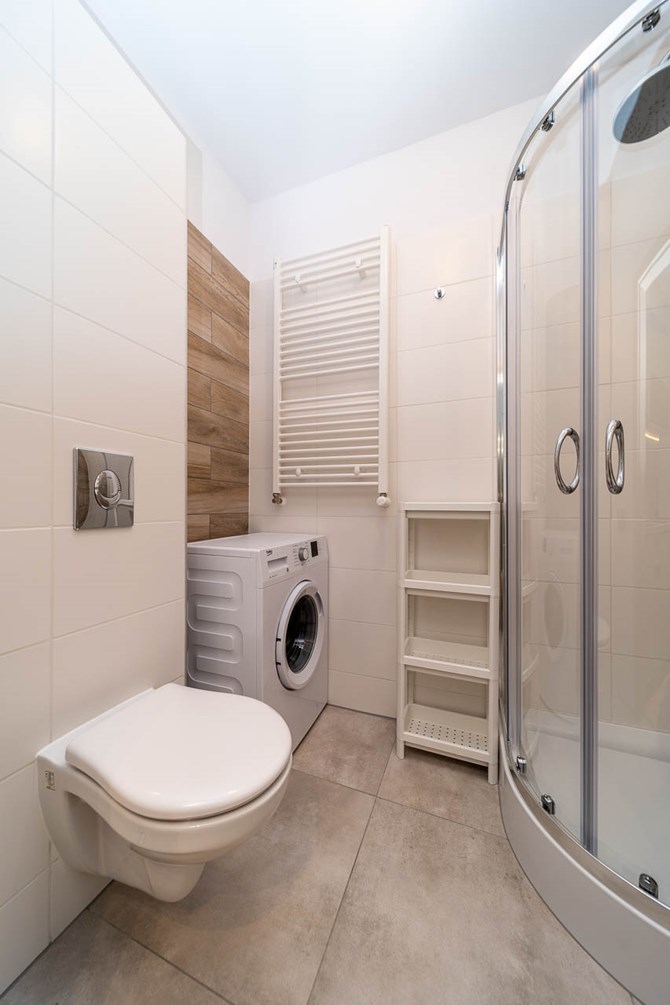 Łazienka razem z WC: lustro z półką, kabina prysznicowa, pralka, regał.