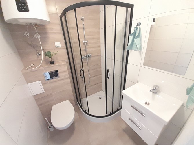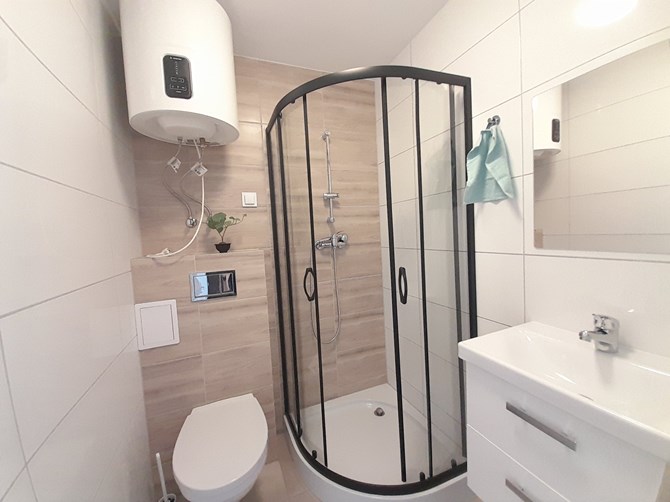 Łazienka z WC: kabina prysznicowa, umywalka, szafka, lustro.