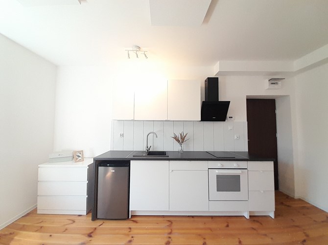 Aneks kuchenny: szafki, płyta elektryczna, piekarnik, lodówka.