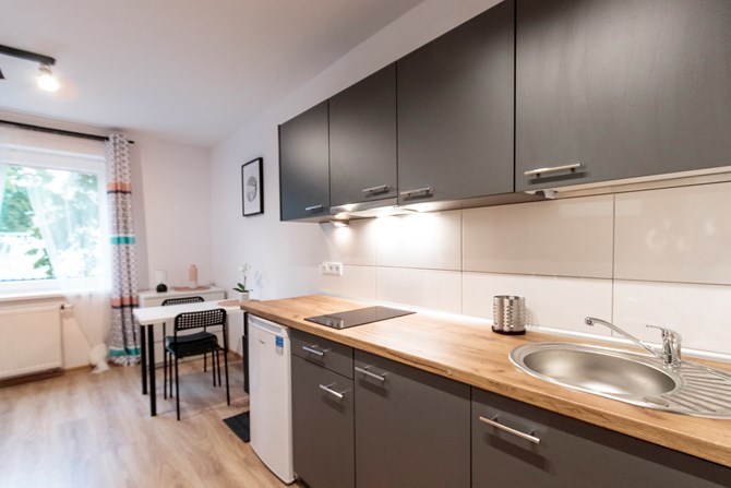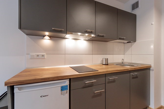 Aneks kuchenny: szafki wiszące i stojące, lodówka, dwupalnikowa płyta elektryczna, zlewozmywak, okap.