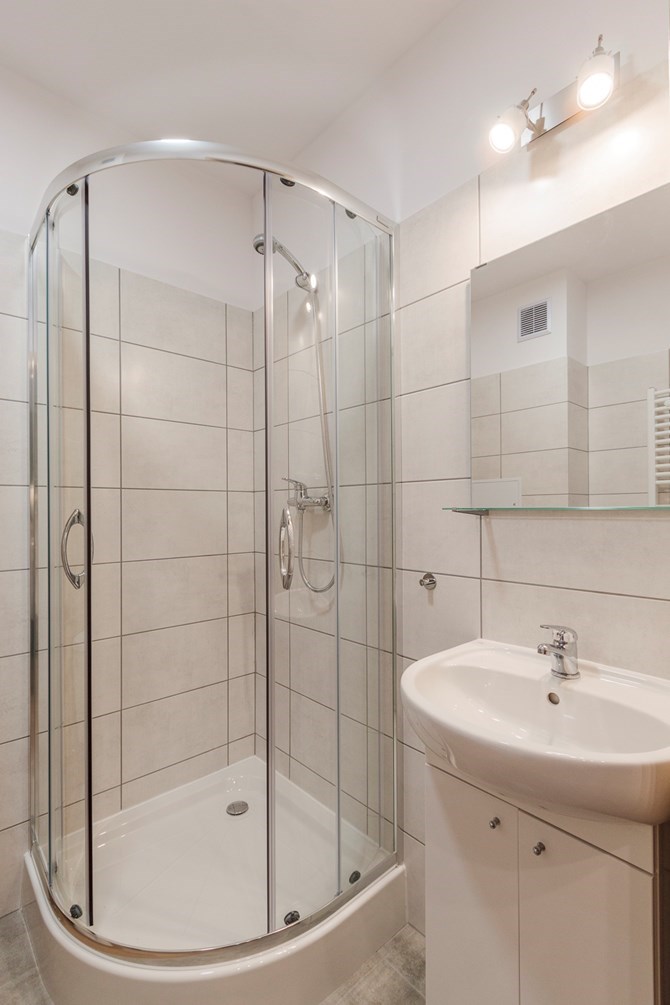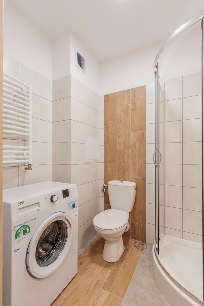 Łazienka: kabina prysznicowa, WC, pralka, umywalka z szafką, lustro z półką.