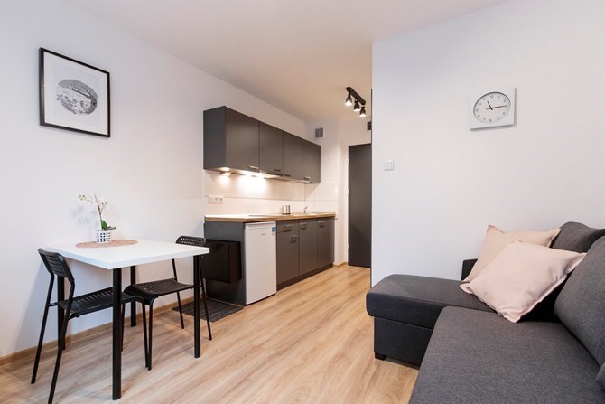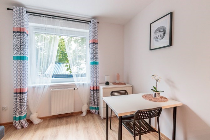 Pokój: rozkładana dwuosobowa sofa, stół z dwoma krzesłami, pojemna szafa, komoda, półka.