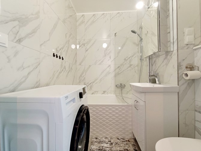 Łazienka: pralka, prysznic, WC, umywalka