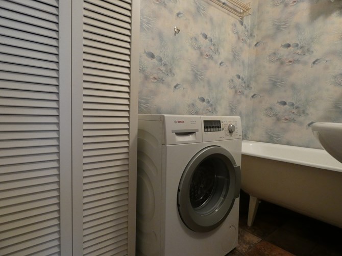 Łazienka: wanna, pralka, umywalka.