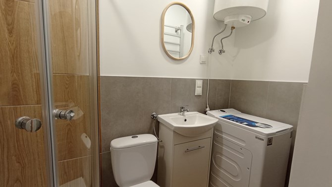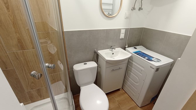 Łazienka z WC: kabina prysznicowa, szafka, lustro.