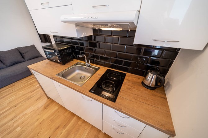 Aneks kuchenny: szafki wiszące i stojące, płyta elektryczna dwupalnikowa, mikrofalówka, lodówka, czajnik elektryczny.