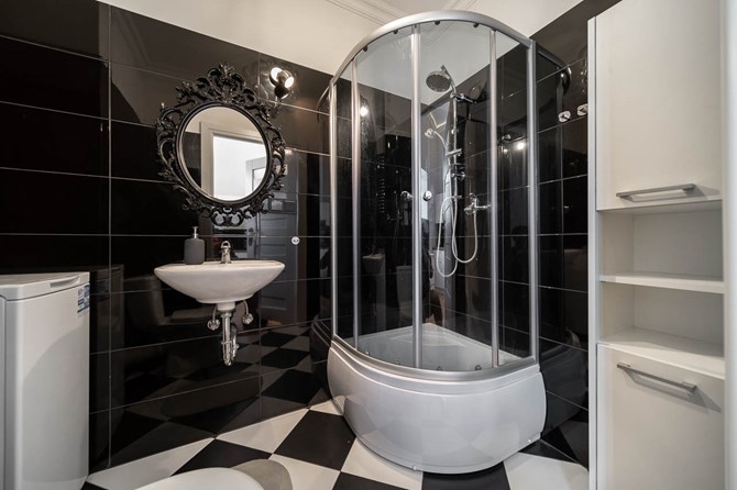 Łazienka: kabina prysznicowa z hydromasażem, pralka, szafka, umywalka, lustro.