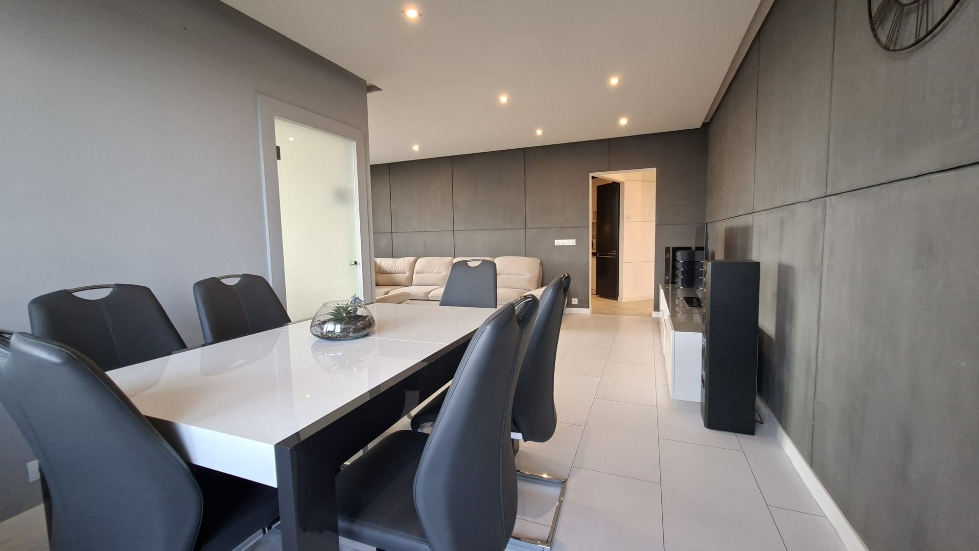 Salon: kanapa, stół z 6 krzesłami, stolik kawowy, szafka RTV, telewizor, kino domowe;