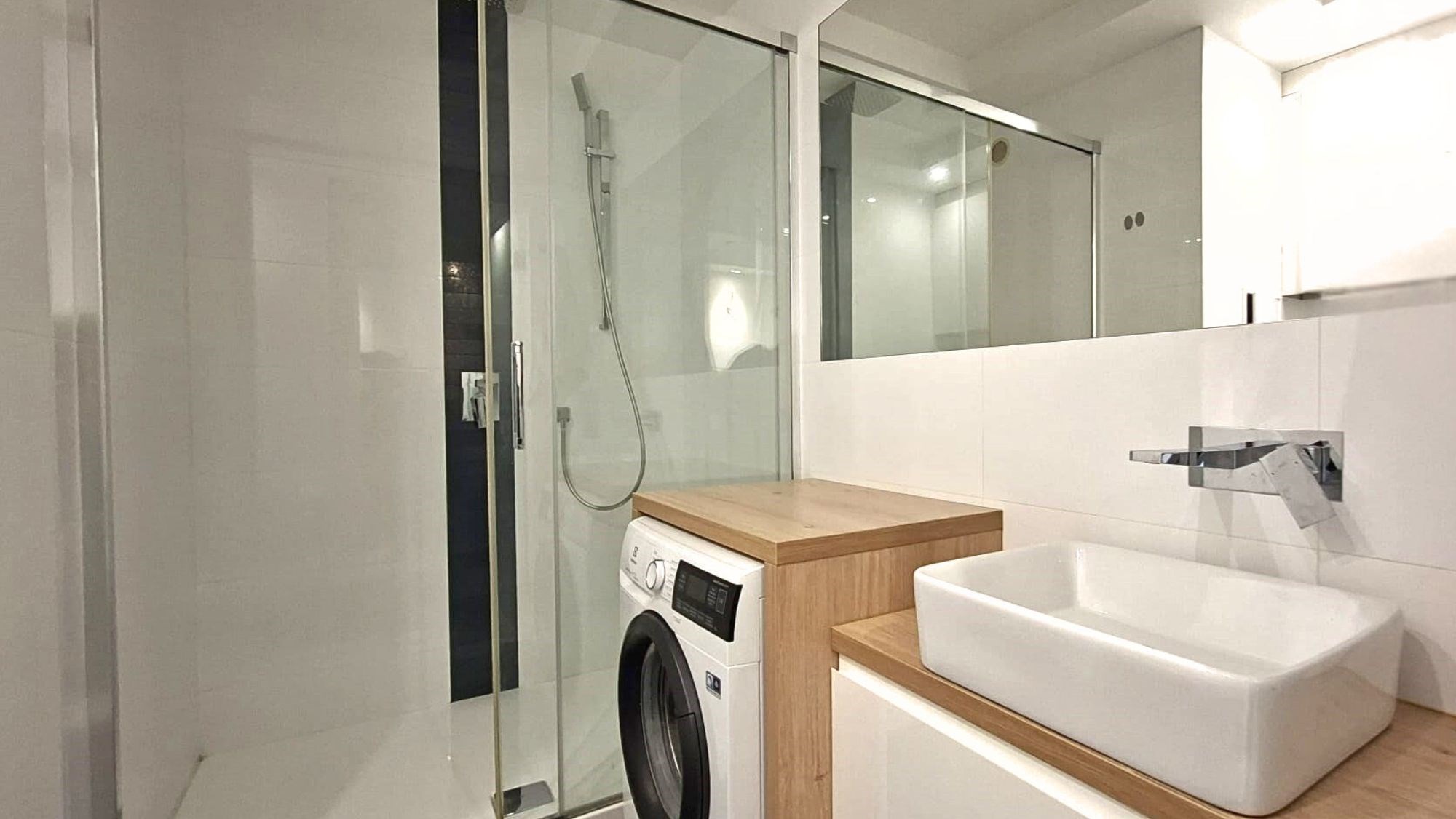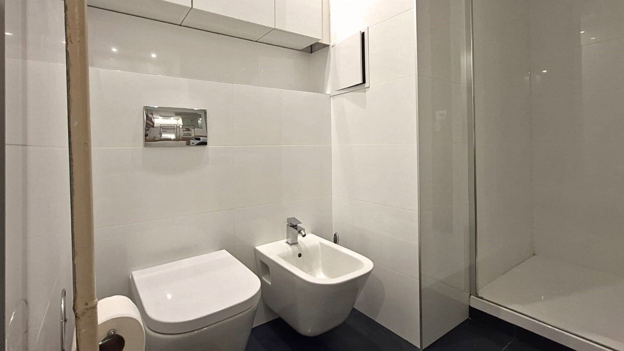 Łazienka z WC: duża kabina prysznicowa, umywalka, szafka, lustro, toaleta, bidet, pralka.