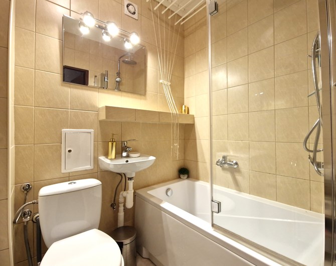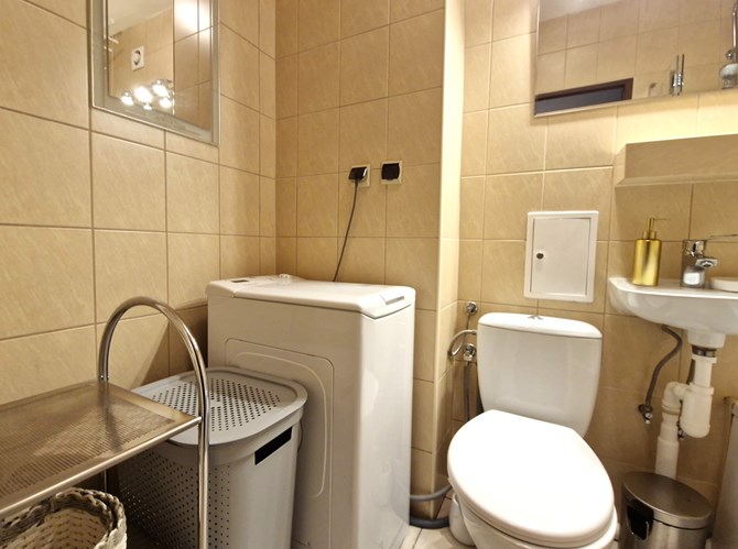 Łazienka z WC: wanna, umywalka, szafka, lustro, pralka.