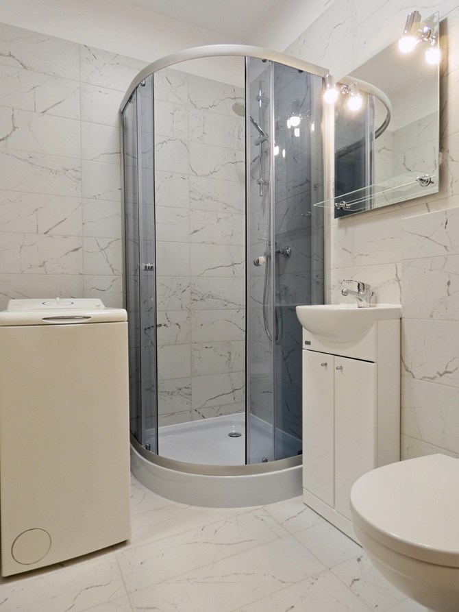 Łazienka: prysznic, pralka, WC, umywalka.